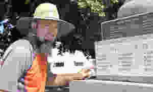 Sach Killam restoring lettering on plaques at the Bourke War Memorial Cenotaph last week Photo: tWH