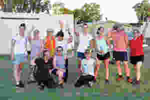 Sydney University exercise science students Phoebe Fraser (far left) and Charlee Mitchell (middle) with Maderlyn Thompson, Eva-Lena Crothers, Tracey Simmonds, Sally Simmonds, Will Mitchell and North West Academic Centre Student Facilitator Charlene Noye (all standing) with Jess Payton, Leonie Brown and Lily Hand (at front) at morning exercise classes at Coolican Oval . Photo TWH